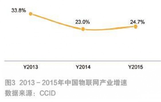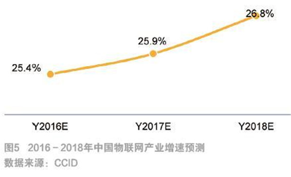 我国就物联网发展也做出了多项国家政策及规划,推进物联网产业体系不断完善。《物联网“十二五”发展规划》、《关于推进物联网有序健康发展的指导意见》、《关于物联网发展的十个专项行动计划》,以及近期颁发的《中国制造2025》等多项政策不断出台,并指出“掌握物联网关键核心技术,基本形成安全可控、具有国际竞争力的物联网产业体系,成为推动经济社会智能化和可持续发展的重要力量。”在物联网发展热潮以及相关政策的推动下,我国物联网产业将持续保持高速增长态势,虽然增长率近年略有下降,但仍保持在23%以上的增长速度(如图3),到2015年,我国物联网产业规模已经超过7500亿元(如图4)。预计未来几年,我国物联网产业将呈加速增长态势(如图5),预计到2020年,我国物联网产业规模超过15000亿元(如图6)。
